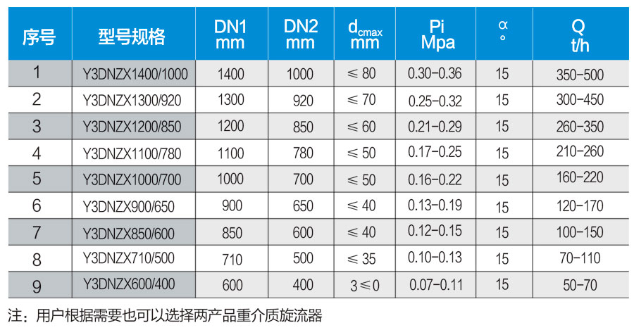 Y3DNZX 系列有壓給料三產品重介質旋流器技術參數表
