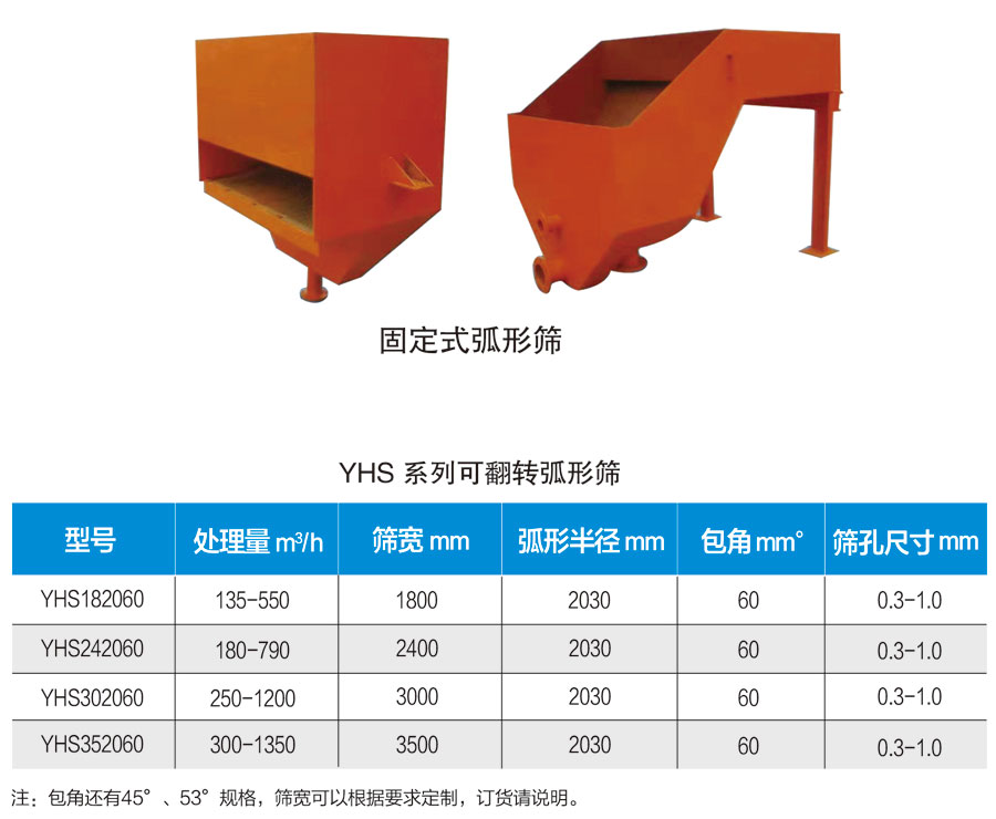 YHS系列可翻轉(zhuǎn)弧形篩其篩面是一段圓弧,物料自流給入給料箱。然后經(jīng)過均衡板按切線方向均勻地沿弧形篩全寬給入,料漿在沿篩面運動過程中被分為篩上產(chǎn)品和篩下產(chǎn)品。其篩箱可在水平放線任意旋轉(zhuǎn)。